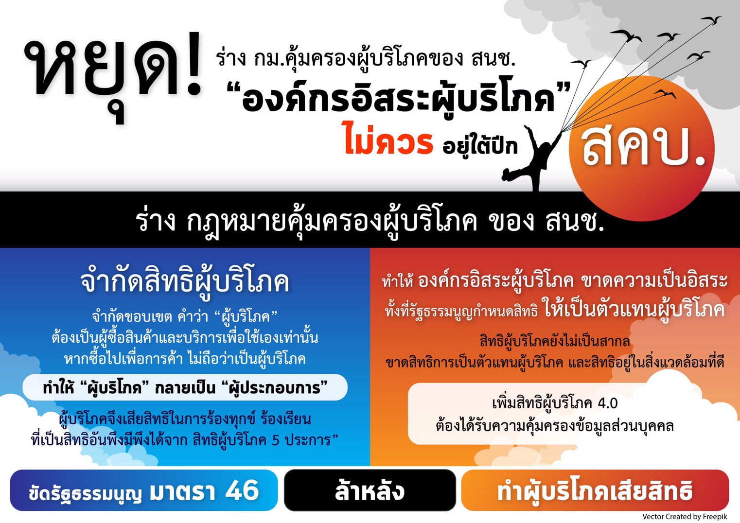 คอบช. พร้อมเครือข่ายผู้บริโภค ติง สนช. ร่างพรบ.คุ้มครองผู้บริโภค อาจขัดร่างรัฐธรรมนูญ พร้อมเรียกร้องให้มีกฎหมายตั้งองค์กรตัวแทนผู้บริโภคที่เป็นอิสระ มีส่วนร่วมกับหน่วยงานรัฐคุ้มครองผู้บริโภค เทียบเคียงกับสภาอุตสาหกรรม หอการค้า