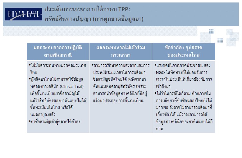 “แม้แต่งานศึกษาที่กรมเจรจาฯจัดจ้างบริษัทเอกชนทำ ยังชี้ว่า ในการเจรจา TPP ที่ 8 ประเทศกำลังเจรจาฯกันอยู่ สหรัฐฯมีข้อเรียกร้องสูงมาก ทั้งการบังคับให้จดสิทธิบัตรพันธุ์พืชพันธุ์สัตว์ การขยายอายุสิทธิบัตร จาก 20 ปีออกไปอีกไม่เกิน 5 ปีเพื่อชดเชยความล่าช้าของกระบวนการขึ้นทะเบียนสิทธิบัตร และให้ขยายอายุสิทธิบัตรที่เกี่ยวกับการผลิตหรือการใช้ยาแบบใหม่เพียงเล็กน้อย การผูกขาดข้อมูลยา 5 ปี สำหรับยาใหม่ และ 3 ปี สำหรับยาที่ได้รับสิทธิบัตรมาแล้ว ในเรื่องนี้ท่าทีสมาชิก TPP อื่นๆยังมองว่า จะทำให้ผูกขาดยาต่อไปเรื่อยๆ จนกระทั่งผู้ป่วยไม่สามารถเข้าถึงยาได้ จำกัดการบังคับใช้สิทธิ (ซีแอล) ไม่อนุญาตให้หน่วยงานจัดซื้อยาของรัฐต่อรองราคายา และบังคับเปิดตลาดเครื่องดื่มแอลกอฮอล์
