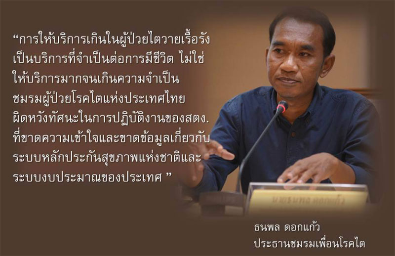 เมื่อวันที่ 4 ก.ค.60 เวลา 13.00 น. เครือข่ายผู้ป่วยโรคไต กลุ่มเครือข่ายผู้ป่วยเรื้อรัง (Healthy Forum) ยื่นหนังสือต่อสำนักงานการตรวจเงินแผ่นดิน (สตง.) ให้พิจารณาทบทวนต่อประเด็นการให้ข้อสังเกตเรื่องการร่วมจ่ายค่ารักษาพยาบาลของผู้ป่วยไตวายเรื้อรังที่ สตง.เสนอต่อสำนักงานหลักประกันสุขภาพแห่งชาติ (สปสช.) เพื่อลดหนี้สินค่าใช้จ่าย ตั้งคำถามถึงรายงานตรวจสอบหน่วยบริการสาธารณสุข ตามระเบียบราชการที่ สตง.ต้องปฏิบัติ
