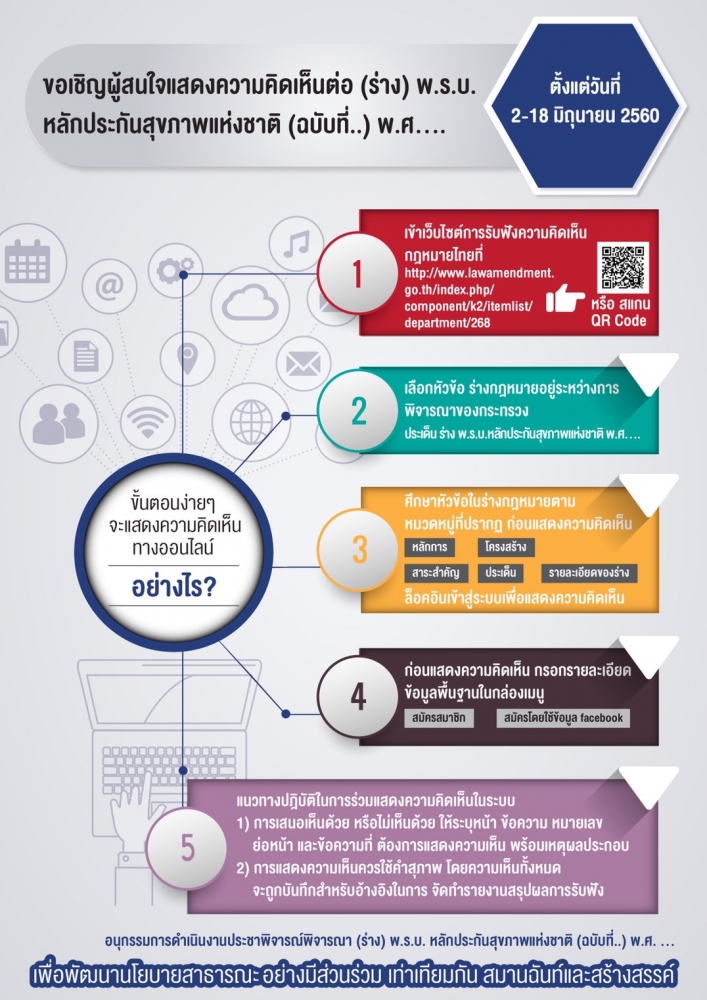 คณะอนุกรรมการประชาพิจารณ์ ร่าง พ.ร.บ.หลักประกันสุขภาพแห่งชาติฉบับใหม่ พร้อมเปิดประชาพิจารณ์ 3 รูปแบบ ทั้งรับฟังออนไลน์, เวทีประชาพิจารณ์ และเวทีปรึกษาสาธารณะ ตั้งแต่ 2-18 มิ.ย.นี้ เวที 4 ภาค เริ่ม 10 มิ.ย.นี้ ที่จังหวัดสงขลา ก่อนจัดทุกภูมิภาคทั่วประเทศ เน้น 14 ประเด็นสำคัญ นพ.พลเดช ชูวิสัยทัศน์สร้างสันติวัฒนธรรม แสดงความคิดเห็นแก้ไขกฎหมายสำคัญ เพื่อให้คนไทยเข้าถึงระบบบริการสุขภาพที่มีคุณภาพ