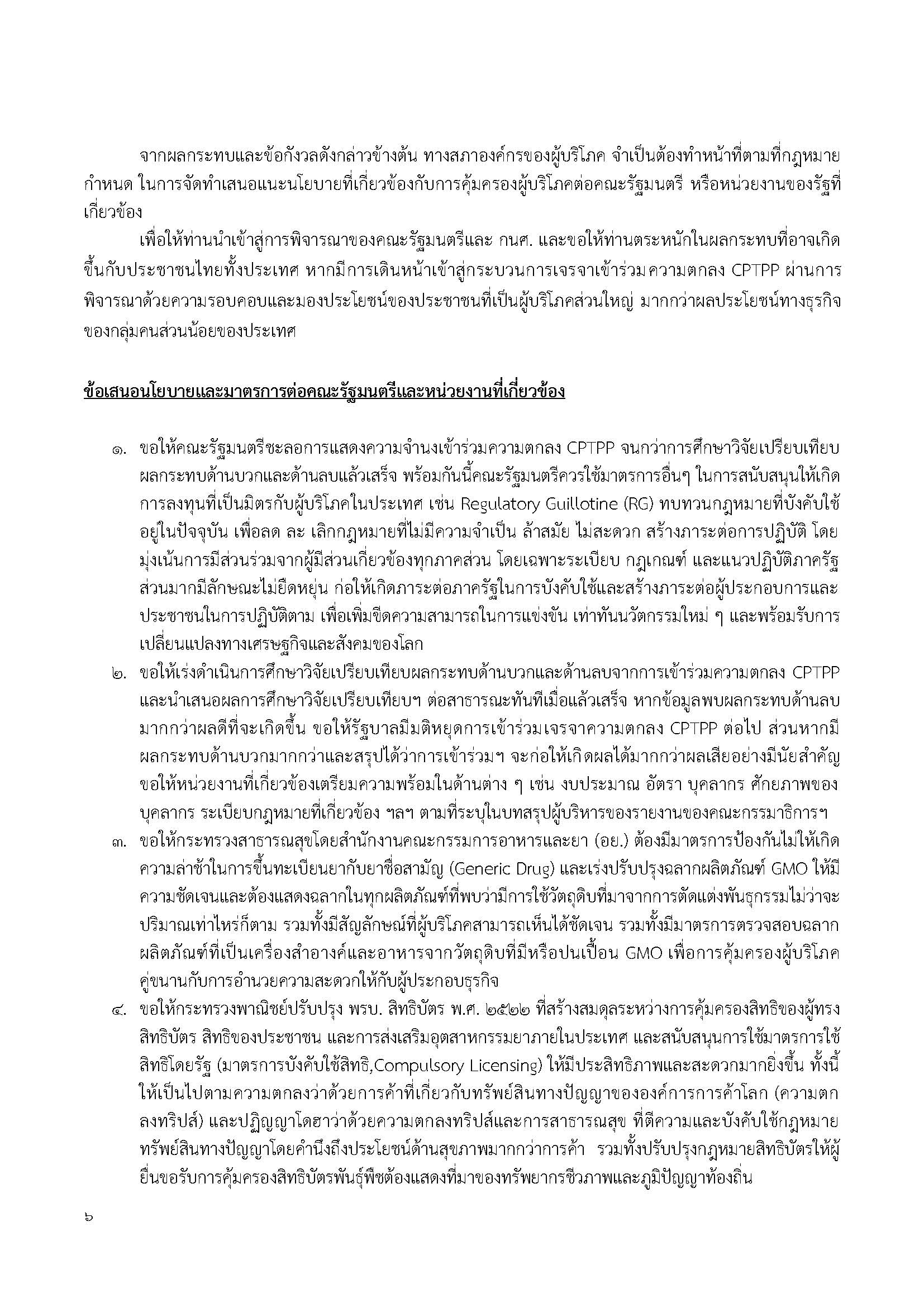 จากเหตุผลข้างต้น สภาองค์กรของผู้บริโภคขอเสนอให้คณะรัฐมนตรี คณะกรรมการนโยบายเศรษฐกิจระหว่างประเทศ (กนศ.) และหน่วยงานที่เกี่ยวข้องกับความตกลงที่ครอบคลุมและก้าวหน้าสำหรับหุ้นส่วนทางเศรษฐกิจภาคพื้นแปซิฟิก (CPTPP) ขอให้ท่านตระหนักในผลกระทบที่อาจเกิดขึ้นกับประชาชนไทยทั้งประเทศ หากมีการเดินหน้าเข้าสู่กระบวนการเจรจาเข้าร่วมความตกลง CPTPP ผ่านการพิจารณาด้วยความรอบคอบและมองประโยชน์ของประชาชนที่เป็นผู้บริโภคส่วนใหญ่ มากกว่าผลประโยชน์ทางธุรกิจของกลุ่มคนส่วนน้อยของประเทศ ดังนั้นสภาองค์กรของผู้บริโภค ขอให้ชะลอการส่งหนังสือแสดงเจตจำนงค์เข้าร่วม CPTPP ตามข้อเสนอนโยบายและมาตรการ โดยมีรายละเอียดตามสิ่งที่ส่งมาด้วย (https://drive.google.com/drive/folders/1tK0k1TyOe09pFcIxEMqlZXLxJ_WGIlmP?usp=sharing)
