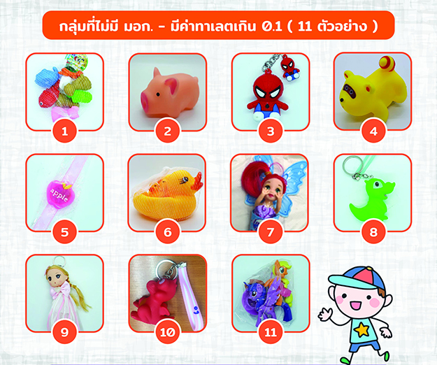 12 ตัวอย่าง ได้แก่ ยางกัดมีที่จับ (สีส้ม-เขียว) ยี่ห้อ Mind Care, ยางกัดเป็ด (สีชมพู) ยี่ห้อ Tesco loves baby, ยางกัด (สีน้ำเงิน) ยี่ห้อ Playskool baby, ตุ๊กตาพ่นน้ำ, กรุ๊งกริ๊ง (สีน้ำเงิน), ชุดตุ๊กตาไดโนเสาร์, อมยิ้มด้ามยาว, ชุดทำอาหารพลาสติก, ตุ๊กตากระต่าย (สีเหลือง), หุ่นยนต์ซุปเปอร์ฮีโร่, ชุดผลไม้ผ่าครึ่ง และตุ๊กตาช้าง (สีน้ำเงิน) ยี่ห้อ NB Toys