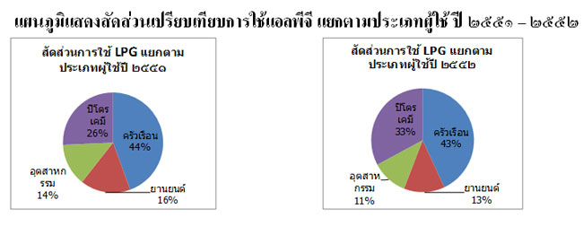 โดยในปี 2549 อุตสาหกรรมปิโตรเคมีใช้ก๊าซแอลพีจีอยู่ที่ 8.3แสนตัน พอถึงปี 2551กลุ่มอุตสาหกรรมปิโตรเคมีมีการใช้เพิ่มขึ้นเป็น1.2แสนตัน หรือมีปริมาณเพิ่มขึ้น 4แสนตัน ในขณะที่ปริมาณการใช้ของภาคยานยนต์ในช่วงเวลาเดียวกันเพิ่มขึ้นเพียง 3แสนตัน