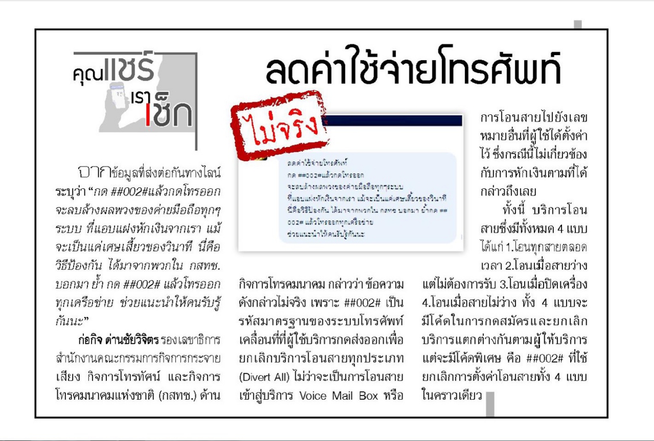 กด##002# ลดค่าใช้จ่ายโทรศัพท์ไม่ได้จริง เขียนโดย ศูนย์ข่าวผู้บริโภค วันที่ 03 กรกฎาคม 2558. จำนวนผู้ชม: 8636 นสพ.โพสต์ทูเดย์ ฉบับวันที่ 3 ก.ค. 5 พิมพ์ อีเมล ก่อนหน้า ต่อไป